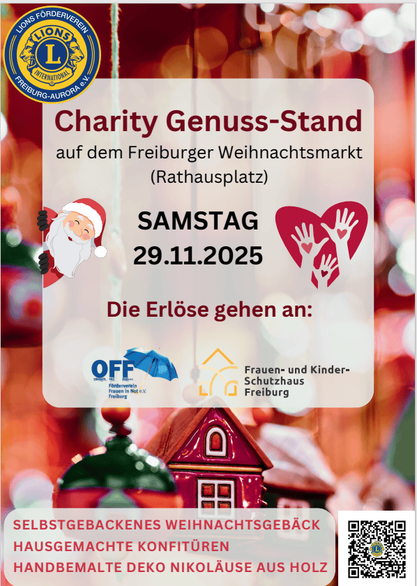 Herzlichen Dank dem Lions Förderverein Freiburg-Aurora e.V., der das Frauen- und Kinderschutzhaus Freiburg am 29.11.2025 mit dem Genuss-Stand auf dem Freiburger Weihnachtsmarkt unterstützt. Wir freuen uns über Ihren Besuch!